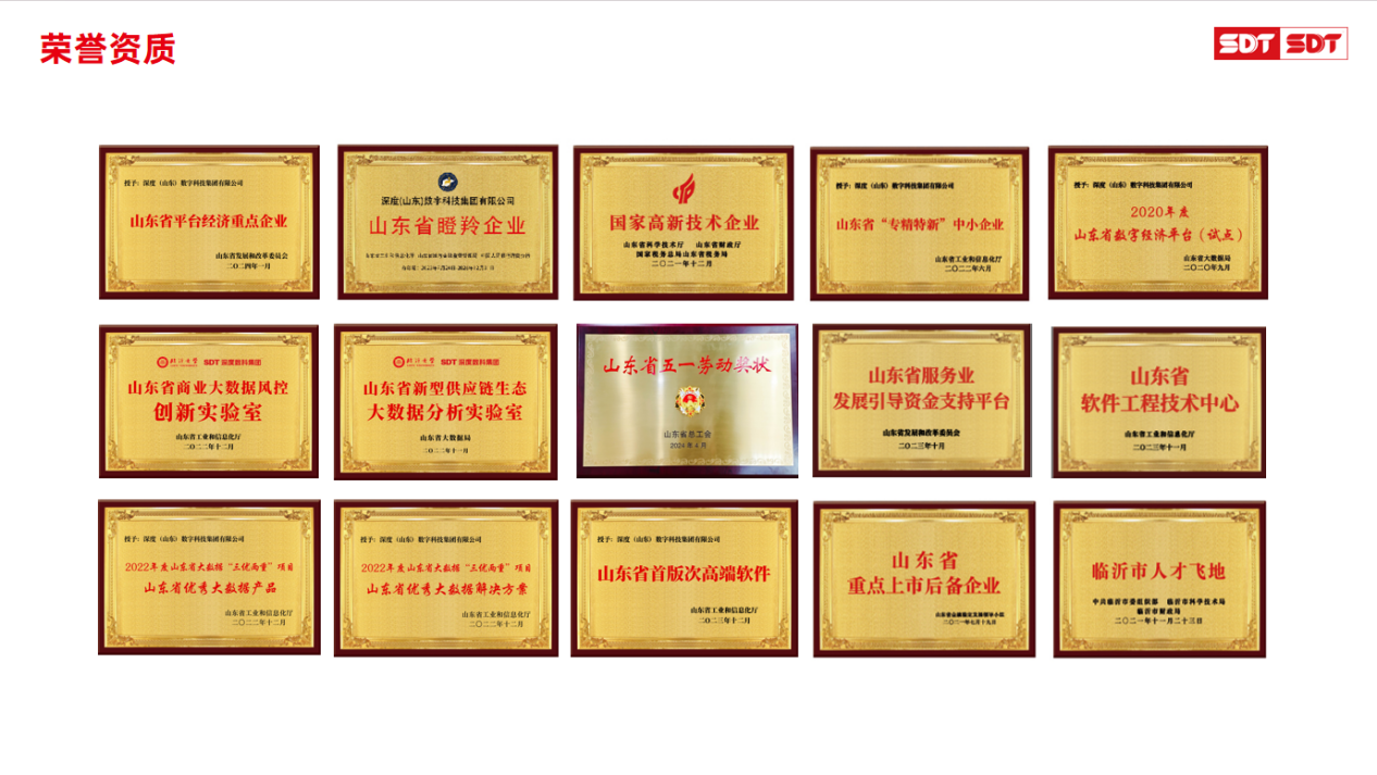 2021年,是集团向科技转型的关键一年,由头部票据服务平台转型为科技创新企业,并获得兰山财金投资集团C轮投资,成为一家具有国资背景的企业。2022年,探索数据业务第二增长曲线,完成了从票据服务到数据服务的延伸发展,被写入兰山区政府2022年政府工作报告,与建设银行等数十家金融机构开展科技普惠合作。2023年,聚焦服务数字商城建设。在第十届资本交易大会上,临沂市委书记任刚、人行山东省分行行长肖龙沧与集团董事长全传晓交流,指出“新金融,数据是要素、科技是手段、平台是生产方式。”。省市领导多次莅临调研考察,支持深度数科做大做强,助力临沂商城高质量发展。荣获山东省瞪羚企业称号。2024年,数据服务能力进一步加强,被写入2024年市政府工作报告。