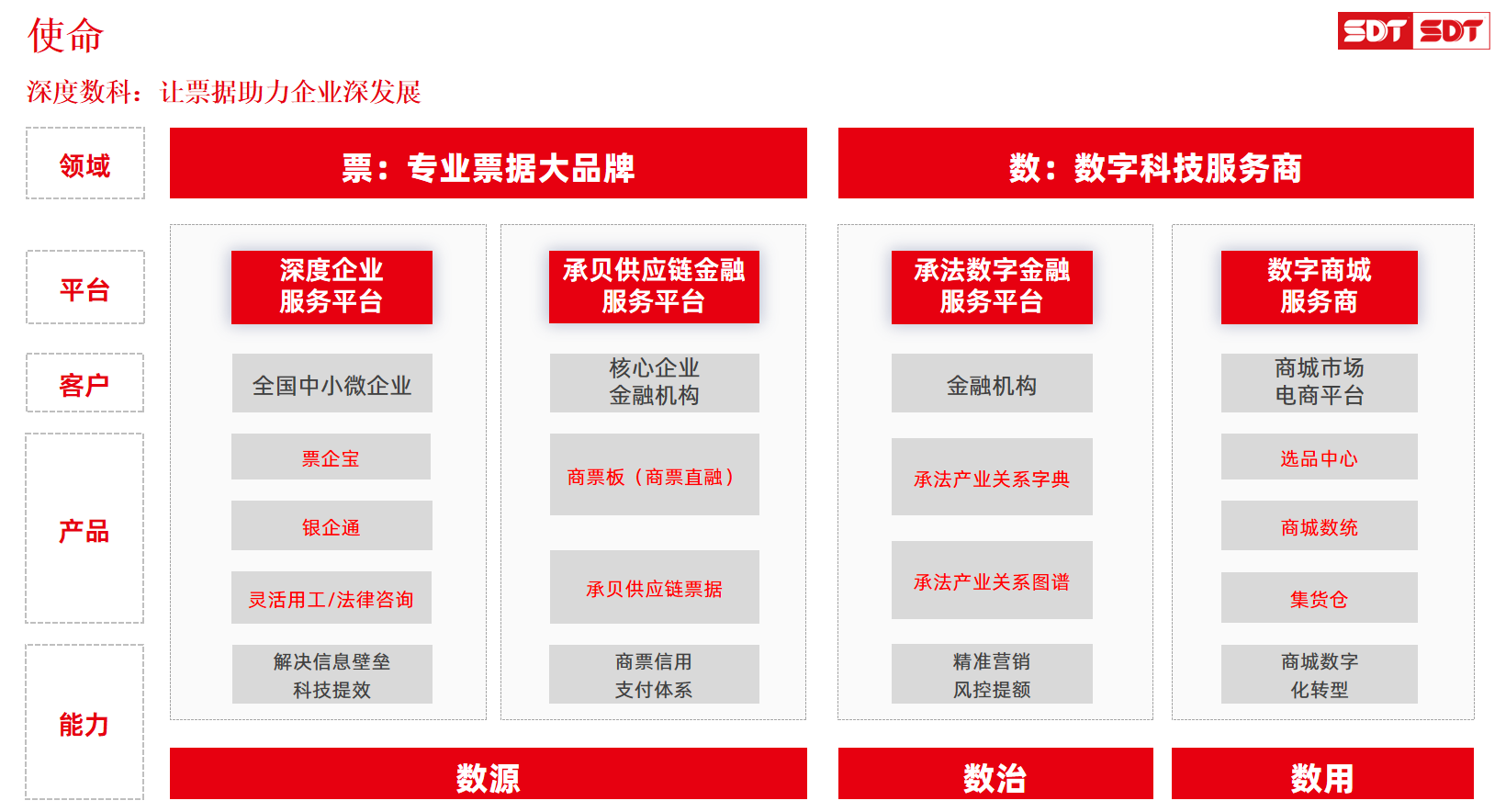 大数据时代,数字化转型已经成为企业寻求增长和保持竞争优势的关键战略。深度数科集团始终秉持科技驱动理念,将票据服务创新与数字经济发展深度融合。通过构建 "科技 + 金融 + 产业" 的立体化服务生态,为企业提供覆盖票据全生命周期的数字化解决方案,助力中小微企业突破传统票据业务的时空限制,从而有力地推动企业顺利迈向数字化转型的征程。