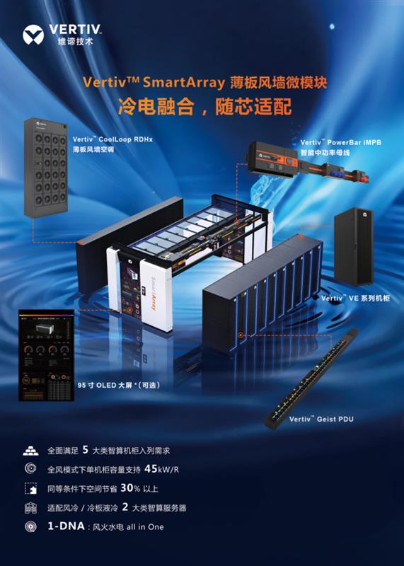 维谛技术(Vertiv)发布的Vertiv™ SmartArray薄板风墙微模块解决方案,即打破了算力限制,赋予算力充分的自由度,全面支持国产算力卡、海外算力卡及异构算力,开启全新AI适配新时代。