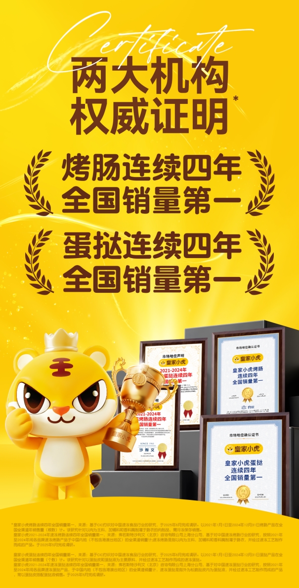 而这份温暖的陪伴,始终以扎实的产品力为根基。从家庭餐桌到全运赛场,皇 家小虎的“冠军”品质始终如一。这份连续四年卫冕烤肠、蛋挞全国销量榜首的实力,这份斩获“福布斯品牌大奖”“福布斯ESG先锋企业”的认可,都源于品牌对“致力于为中国大众消费者提供高品质的速冻食品,做用户的美好生活陪伴者”的坚守。未来,皇 家小虎还将带着这份匠心与温度,走进更多生活场景,用美味连接情感,用陪伴传递力量,成为更多人生活中的“暖心搭档”。
