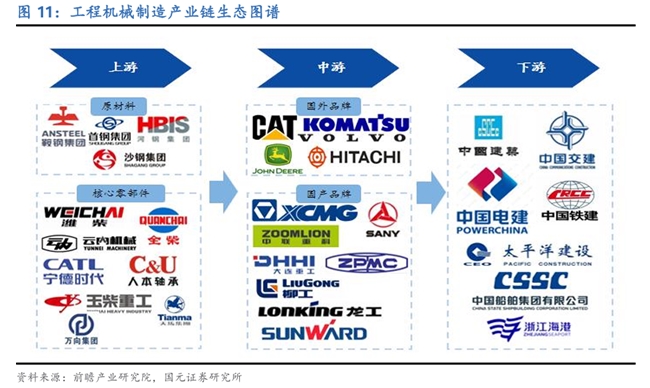 工程机械是国民经济发展的重要支柱产业之一。我国工程机械行业已形成以整机制造商为核心、上下游协同发展的完整产业链生态体系。其中行业上游包括首钢集团、潍柴动力等关键零部件供应商,中游由三一重工、柳工等龙头企业主导整机生产并已经形成梯队化竞争格局,下游覆盖领域广泛延伸至传统制造、基建、房地产等行业以及租赁、再制造等后市场服务。
