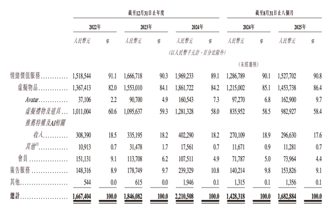 招股书显示,Soul的收入结构主要由情绪价值服务、广告及其他收入构成,其中情绪价值服务在总收入中的占比超过九成。
