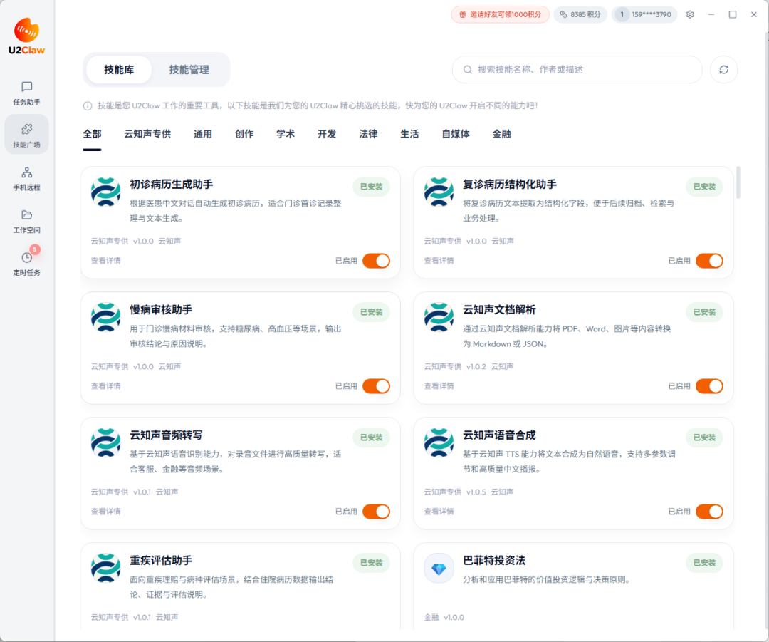 在核心执行能力上,U2Claw深度集成语音识别、语音合成、文档处理三大核心模块,无缝融合医疗垂直领域模型能力,预先内置77+个覆盖高频场景的专业Skill,无需额外插件与复杂Prompt调试。实际应用中,语音输入医患对话即可自动生成标准电子病历,整合多平台碎片化信息可快速输出完整行业调研报告,兼顾企业智能办公与个人效率提升双场景需求。