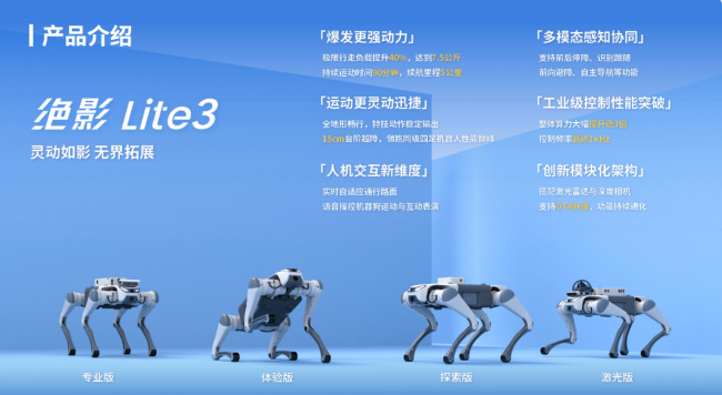 绝影 Lite3(科研教育 & 轻型巡检机器人):作为轻量化多场景适配产品,提供专业版、体验版、探索版、激光版等多版本选择,搭载自研 J60 高性能关节模组,最 大负载 7.5kg,续航里程 5 公里,可稳定跨越 18cm 台阶,工业级实时控制系统让整体算力提升近 3 倍,控制频率高达 1kHz。同时具备高速移动、智能识别跟随能力,适配轻型安防巡检、机场围界巡检等轻量化巡检场景,是科研教育与轻型巡检场景的双适配选择。