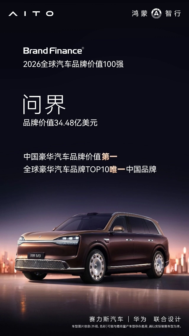 据了解,在Brand Finance发布《2026全球汽车品牌价值100强》榜单中,问界首次上榜,以34.4788亿美元的品牌价值、问界品牌强度指数(BSI)77.8,位居中国豪华汽车品牌价值第 一,成全球豪华汽车品牌TOP10中*中国品牌。毫无疑问,中国高端新能源品牌在全球范围内的价值跃升,迎来里程碑时刻。