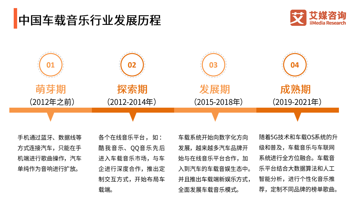 中国车载音乐行业的发展历程可以追溯到10年前。据《报告》显示,2012年以前国内车载音乐行业尚处于萌芽期,用户通常用蓝牙或数据线连接汽车音响,借此播放手机中的音乐。2012年,酷我音乐率先进入车载市场,推出国内*音乐车载应用程序,这也标志着在线音乐平台布局车载端的“*枪”。初步尝试之后,酷我音乐在2016年正式成立车联网事业部,全力打造车载音频软件。