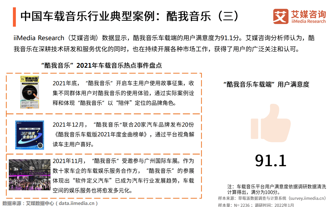 另一方面,持续开展的各项市场工作也为酷我音乐的高满意度加持。《报告》显示,酷我音乐车载端2021年相继进行了车主故事征集、联合奔驰、一汽、上汽、比亚迪等20家车企发布20份不同的年度金曲榜,抓住了新时代背景下人们消费时重视的因素,正在从功能、价格、质量逐渐变为精致、个性和情感诉求的特点,并用大数据呈现了个体内心的温情和暖意,点燃了个体的感情爆发,真正体现了“陪伴”的价值。酷我音乐提供的也不只是冷冰冰的数据征集与统计,而是营造一次情感的连接和认同,在展示对用户关怀的同时,也由此获得了用户的广泛认可。