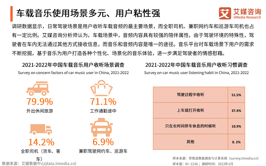 近年来,随着智能网联汽车政策红利的不断释放与5G+V2X技术的进一步融合,车联网进入了快速发展期,多个细分赛道迎来爆发。以车载音乐行业为例,近日第三方数据挖掘和分析机构艾媒咨询发布《2021-2022年中国车载音乐市场发展趋势研究报告》(以下简称《报告》)指出,随着AI和5G落地,车联网赛道持续发展,车载端在线音频的市场需求也将持续放量,预计2022年将超过150亿元。同时伴随行业向头部平台集中,酷我音乐作为*玩家将吸引更多资源,引领车载音乐发展。