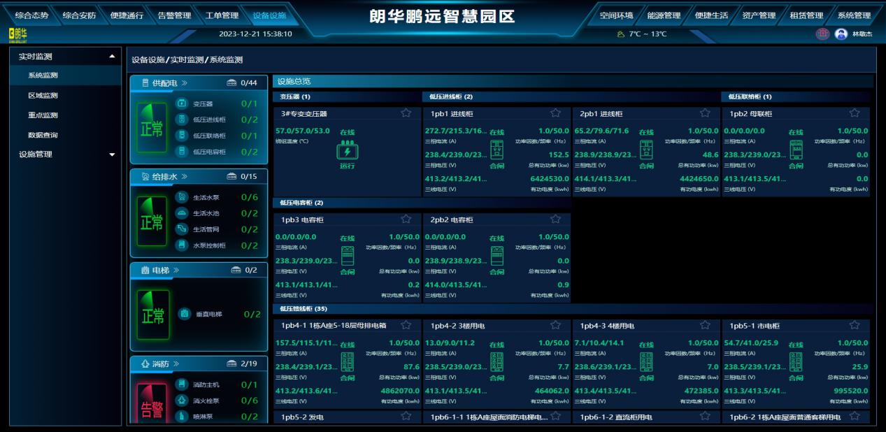 随着互联网、大数据、人工智能与实体经济的深度融合,数字化对传统产业转型升级提供了新动能。朗华物业这一领域累积了大量的技术和经验,为了通过数字化手段让这些技术、经验真正为客户所用。从2023年10月启动设计到最终1.0版本诞生,项目团队只用了3个月时间。该平台集成了建筑设备监控系统、安防系统、车辆管理系统、智能照明系统、机房动力环境系统、智慧服务系统、消防广播系统、能耗监控系统等八大建筑智能化系统,支持多个维度日常运行监测与管理,使状态可视、事件可控、业务可管,最终实现管理的科学化与智能化,提升运营效益。在此前提下,团队在研发2.0版本时,拓展更多的应用场景,这其中包含团队自主研发的基础设施设备,比如整个项目的能源控制、能耗控制、水电风系统的控制维护等,也包含嫁接的第三方应用。有别于传统系统,业主在平台上看到的不仅仅是故障所在的点位,更能清楚了解故障设备的所有基本属性,包括其生产厂家、可能引发故障的原因。