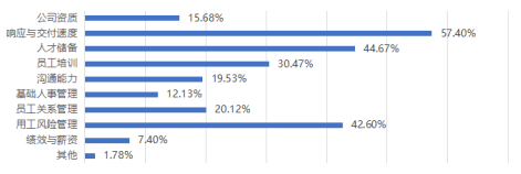 从用工企业“期望人力资源服务公司改善的方面”,也可以从另一个角度挖掘当前企业灵活用工管理中的问题。被用工企业提及最多的是“响应与交付速度”(57.40%),可见人员招聘与交付仍然是用工企业最重视的问题,也是当前多数企业在灵活用工中仍然面临的问题。“人才储备”、“员工培训”分别占44.67%、30.47%,这两个方面反映的是用工企业对改变当前员工质量问题的期望。42.20%的用工企业期望人力资源服务公司改善“员工风险管理”,这与前面的“劳动争议与员工维权”、“管理困难”相对应。期望人力资源服务公司改善“员工关系管理”、“沟通能力”的用工企业均在两成左右,然后依次为“基础人事管理”、“绩效与薪资”,这四个方面反映的均是用工企业在日常管理中使用人力资源服务面临的问题。