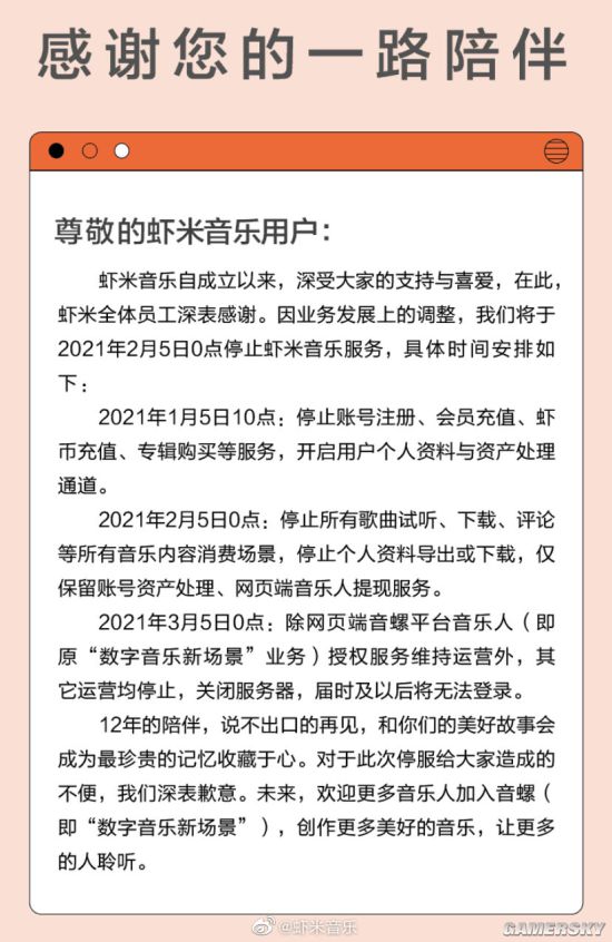 1月5日上午,虾米音乐发布官方声明表示,由于业务调整,虾米音乐播放器业务将于2021年2月5日正式停止服务。