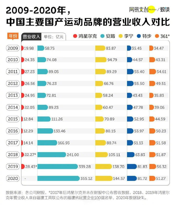 近十年主要国货运动品牌的营收对比