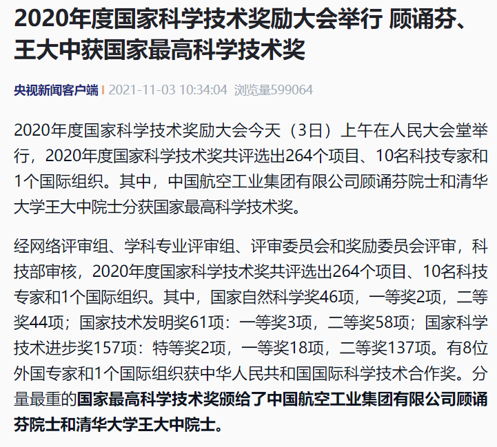 2020年度国家科学技术奖励大会在人民大会堂举行,2020年度国家科学技术奖共评选出264个项目、10名科技专家和1个国际组织。其中,中国航空工业集团有限公司顾诵芬院士和清华大学王大中院士分获国家最高科学技术奖。(央视新闻)