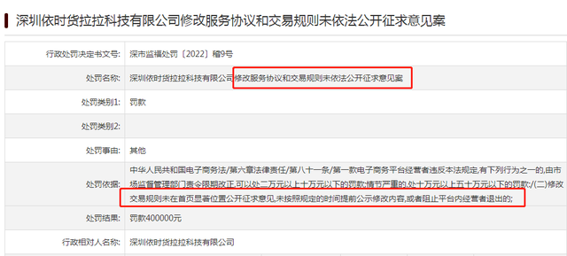 天眼查信息显示,2月24日,因修改服务协议和交易规则未依法公开征求意见,货拉拉关联公司深圳依时货拉拉科技有限公司被深圳市市场监督管理局福田监管局罚款40万元,决定文书号为深市监福处罚〔2022〕稽9号。