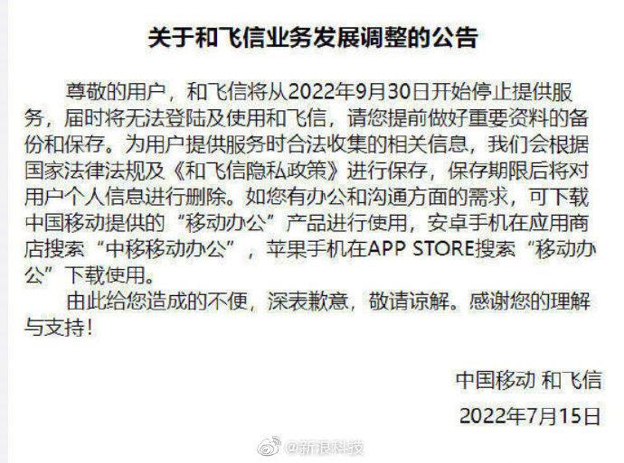 中国移动近日发布公告,宣布调整和飞信业务,自9月30日开始停止提供该服务,这意味着曾经收获5亿注册用户的飞信APP将正式走下历史舞台。公告如下:尊敬的用户,和飞信将从2022年9月30日开始停止提供服务,届时将无法登陆及使用和飞信,请您提前做好重要资料的备份和保存。为用户提供服务时合法收集的相关信息,我们会根据国家法律法规及《和飞信隐私政策》进行保存,保存期限后将对用户个人信息进行删除。