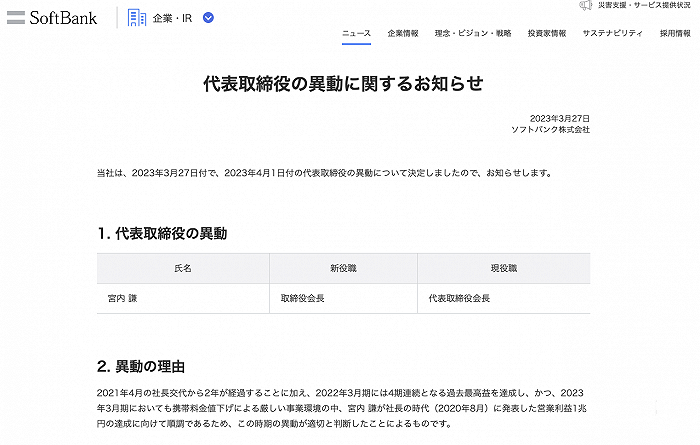 3月27日,软银官网宣布,公司董事长宫内谦将于4月1日起取消代表董事的头衔,仍担任董事长。