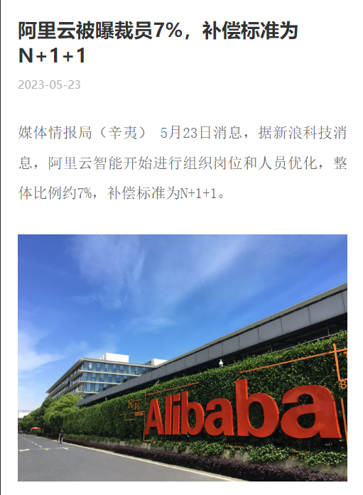 媒体情报局 5月23日消息,据新浪科技消息,阿里云智能开始进行组织岗位和人员优化,整体比例约7%,补偿标准为N+1+1。