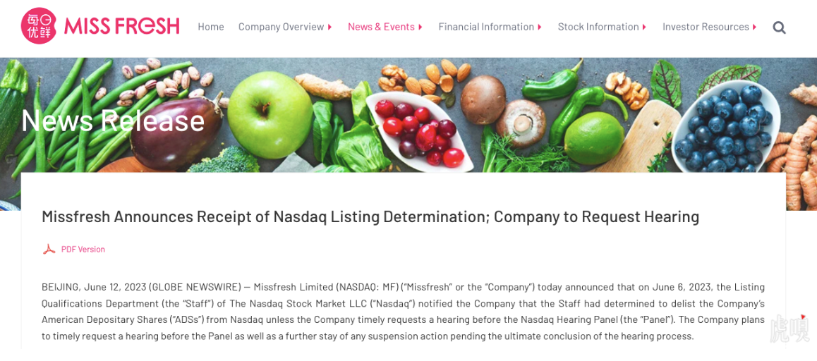 每日优鲜收到纳斯达克摘牌通知:将要求举行听证会。