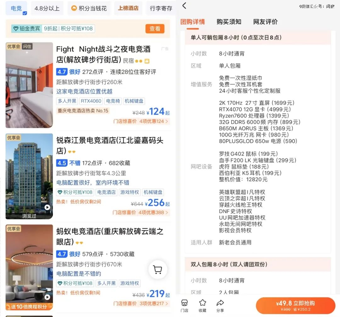 闻旅对此也做了一个小调研,以重庆市热门商圈解放碑为例,某网咖的高刷高帧区8小时包夜团购价格49.8元,双人需团双份价格也不到100元。