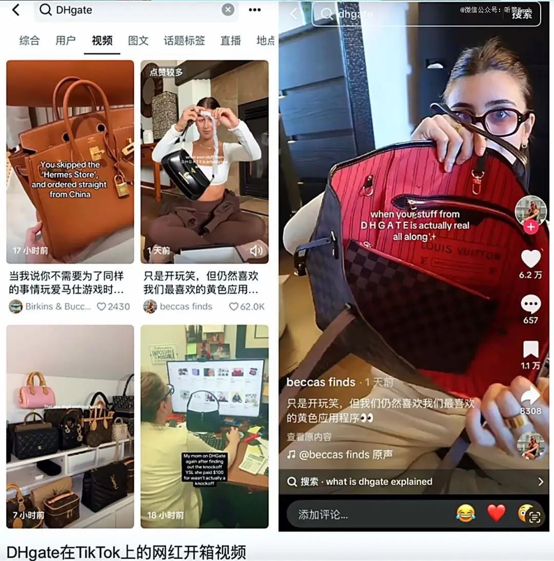 一位TikTok博主beccas finds,发布的开箱视频,展示了LV、Prada的品牌包袋与鞋,但视频内容则用一行小字暗示观众,“可以去DHgate这样的平台,用更低的价格购买到类似的商品(when your stuff from DHgate is actually real all along)。”