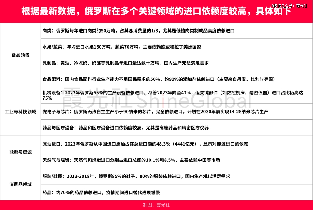 其二,中俄贸易的互补性越发明显。早在苏联时期,俄罗斯重点发展如军事工业、能源、钢铁等重工业,这种产业结构的侧倾,导致俄罗斯轻工业基础薄弱,直到现代都没有摆脱这种产业结构失衡的困境。因此,在轻工业方面,俄罗斯一直需要依靠进口来补缺。如在食品领域,俄罗斯对肉类、乳制品、水果/蔬菜的进口依赖度超50%;工业领域,高端设备、芯片、药品的进口依赖度超70%;服装、鞋履等轻工业品依赖度更高,超80%。因此,*性价比优势的中国商品迅速在快消、电子产品、汽车等领域登场,填补了市场空缺。