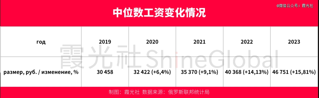 我们也观察了俄罗斯2019-2023年的工资中位数变化,发现呈现持续上涨的趋势。去年6月,普京宣布*工资将与平均工资挂钩。自2025年起,*工资将为平均工资的48%,达到2.2万卢布(约合人民币1973.23元),也就是还会再增长15%左右。 2030年的目标是实现*工资至少为3.5万卢布(约合人民币3139.23元)/每月。