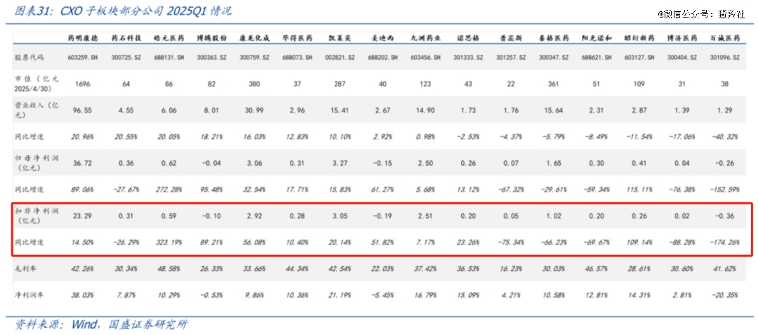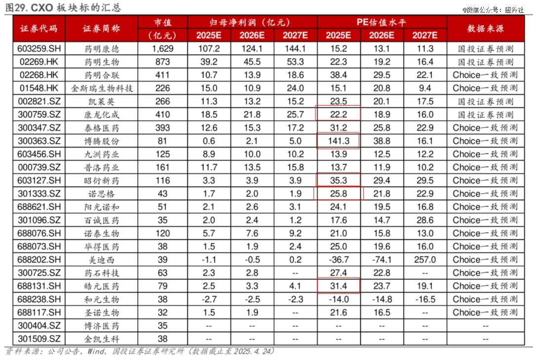 从上图2025Q1取得高双位数甚至三位数增长的CXO公司中,我们据下方的国投医药截至4月24日的估值表,可以看到这些公司对应2025年的动态市盈率水平都在25倍以上,这可能反应了市场对其今年成长性所给出的估值水平。