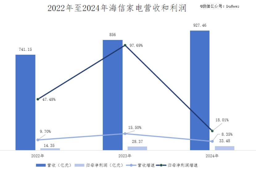 另据海信家电发布的2024年年报显示,当年海信家电营收和归母净利润分别同比增长8.35%和17.99%,分别至927.46亿元和33.48亿元。营收和归母净利润增速,均创下近三年最 低增速。