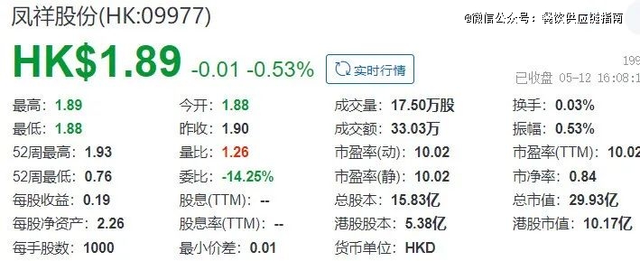 截至5月12日收盘,凤祥股份的股价定格为1.89港元。对比其登陆港股时的发行价3.33港元,缩水明显。总市值也从上市当日的47亿港元,下降至目前的不足30亿港元,蒸发了近4成。