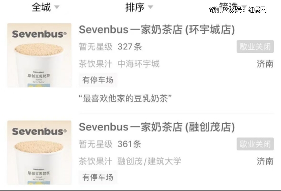 此外,在Seven bus官方小程序里,品牌位于济南、宁德、青岛、沈阳等地的门店较少,目前均已显示为“打烊” 。大众点评则显示,济南、青岛两地的Seven bus门店都已是“歇业关闭”状态。宁德和沈阳,则已经搜索不到相关门店信息。
