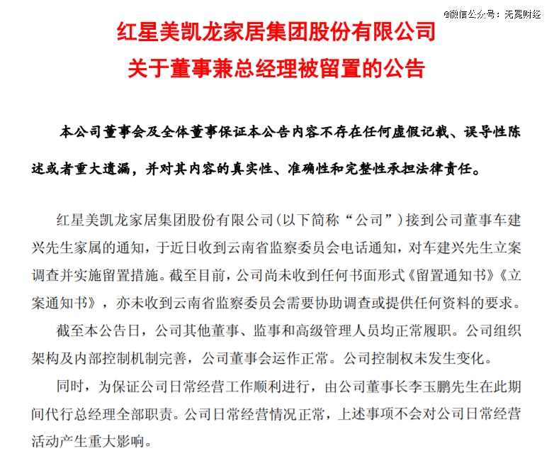按美凯龙的公告,公司尚未收到任何书面形式《留置通知书》《立案通知书》,亦未收到云南省监察委员会需要协助调查或提供任何资料的要求。