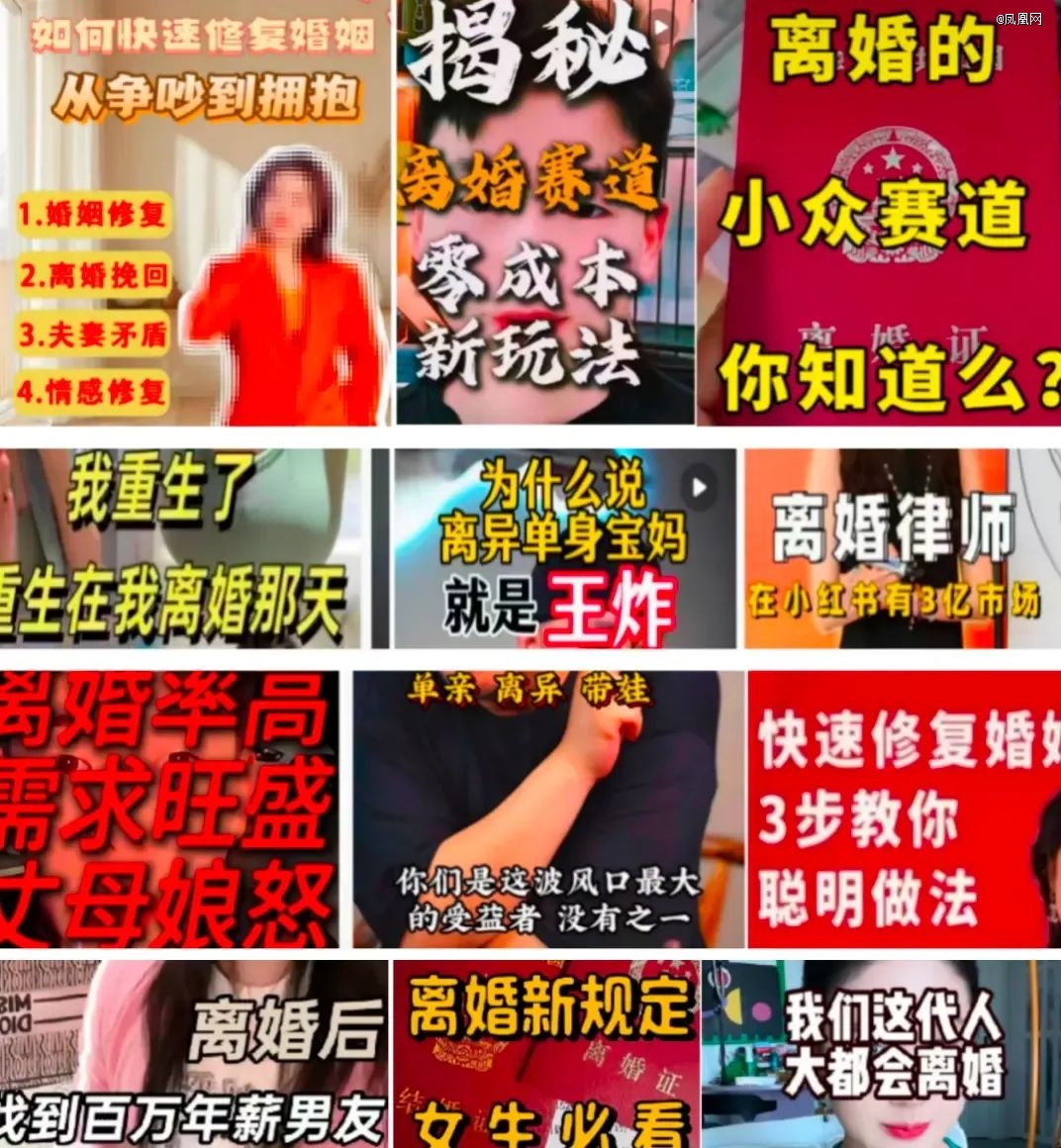 凤凰网《风暴眼》发现,当前离婚IP培训市场已形成完整产业链。有男性博主以《一招教离异女人上岸搞钱》《搞钱的能手就是离婚少妇带娃》《负债100万的单亲妈妈如何翻身》等视频内容吸引离婚女人的付费变现,不少培训及机构开设《离婚IP孵化营》《如何把分手谈判录成vlog》等实操课。