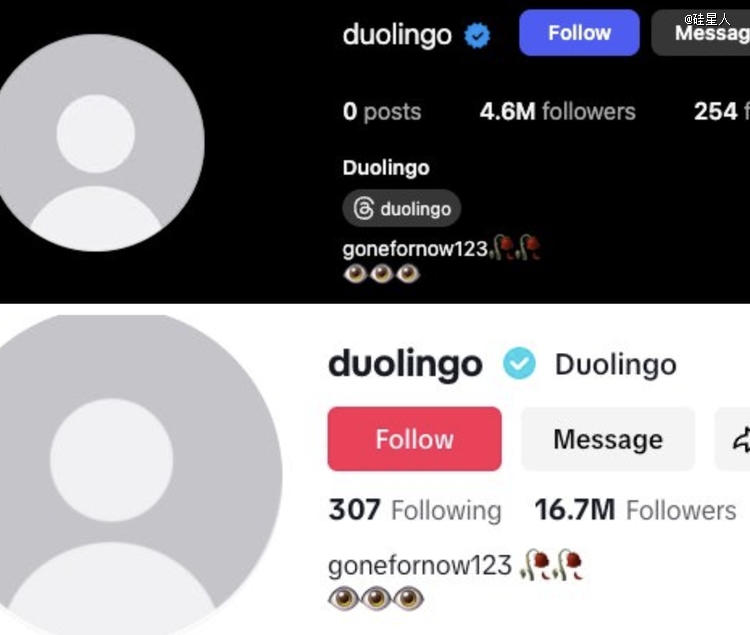 2025年5月17日,当Duolingo突然清空其TikTok和Instagram上的所有内容时,1000多万粉丝面对的是一片虚无。账号简介只剩下神秘的“gonefornow123”,配着枯萎的玫瑰。