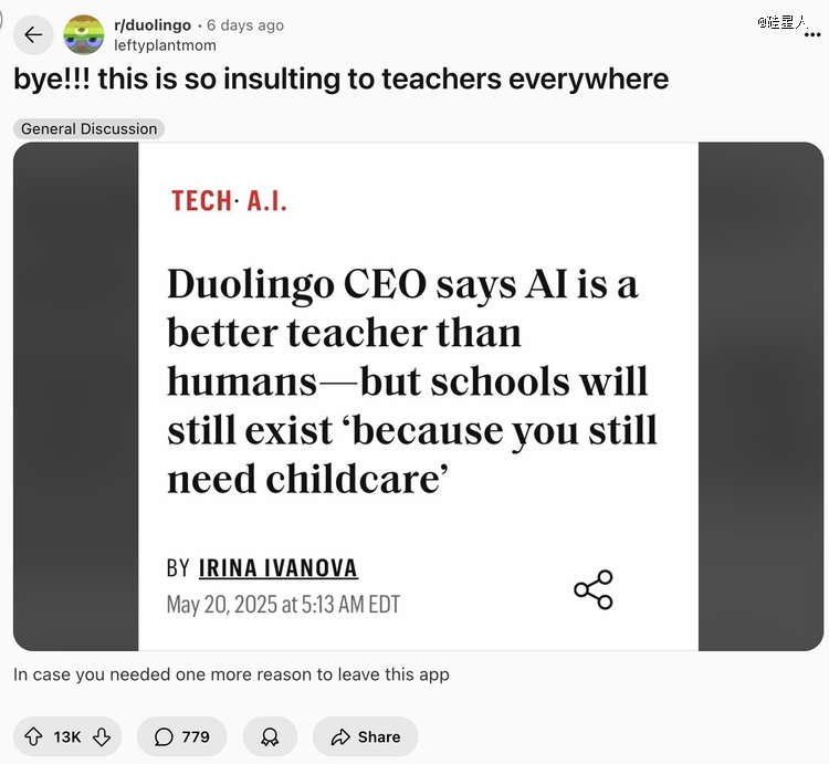 三周前,CEO Luis von Ahn刚刚宣布公司将转向“AI-first”战略,计划用人工智能逐步取代承包商。消息一出,社交媒体炸开了锅。“Mama,may I have real people running the company?”这条评论获得了69,000个赞。用户们开始删除app、取消订阅,有人甚至录制视频,亲手终结了1500多天的连续学习记录。
