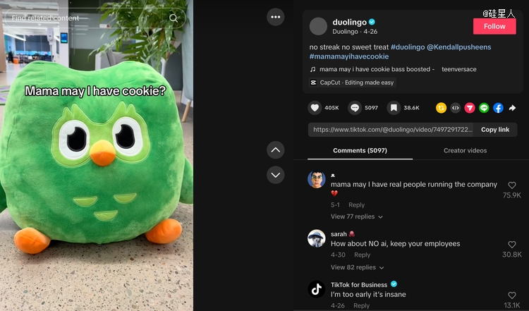邮件公开后48小时内,Duolingo的社交媒体评论区彻底沦陷。在TikTok上,一个播放猫头鹰玩偶问“Mama,may I have a cookie”的趣味视频下,最高赞评论变成了“Mama,may I have real people running the company”,获得了超过75000个赞。