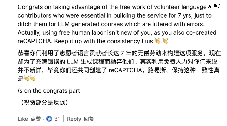 眼看神秘营销失败,5月22日,Luis von Ahn不得不亲自出镜,与“反抗者”展开对话。但整个对话避重就轻,当被问到“还会有人类员工吗”时,他强调“我们会继续雇佣员工”,却对承包商的命运只字不提。