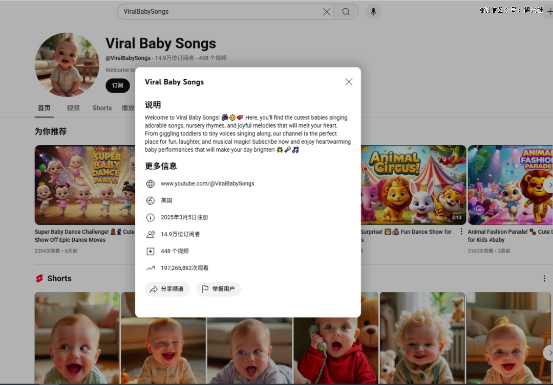 参考一个在YouTube上迅猛增长的频道@ViralBabySongs。这个频道的内容很简单,就是萌娃对口型唱歌的AI视频,表演童谣和咯咯笑,萌娃形象和配音基本依靠AI工具完成,但增长效果极其惊人。