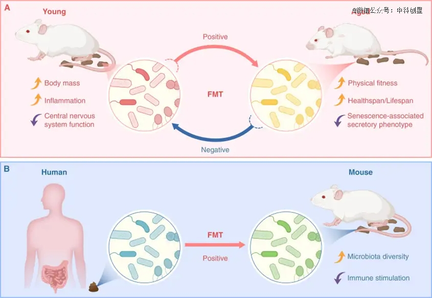 随着人类对于肠道微生物的研究不断深入,科学家发现当年轻小鼠接受来自老年小鼠的肠道微生物群时,它们展现出了加速衰老的表型。反之,接受年轻小鼠肠道微生物群的老年小鼠,它们的衰老速度得到了延缓。