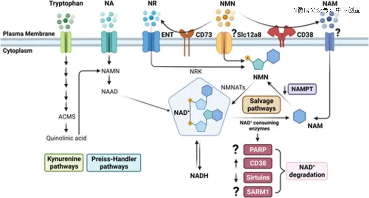 因为NAD+水平的变化总是与衰老和年龄相关疾病同时出现,学界认为有望通过调节NAD+水平,来治疗这些疾病。而最近几年电商平台大火的抗衰老补剂NMN(烟酰胺单核苷酸),便是NAD+的前体。人们可以通过口服NMN,来增强体内NAD+的水平。