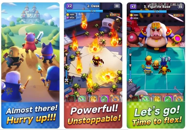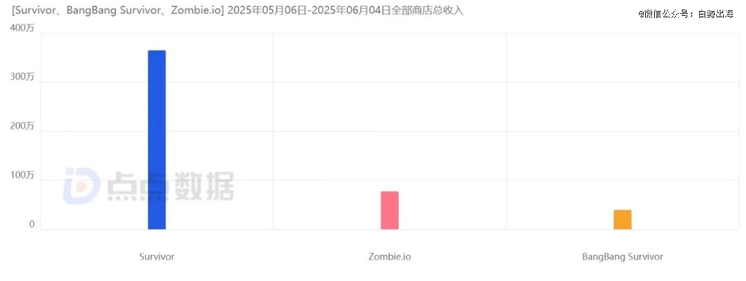 此后,也有不少头部厂商尝试类似的玩法思路,比较有代表性的就是由大梦龙途开发、露珠游戏海外发行的「向僵尸开炮(BangBang Survivor)」以及 4399 的「射射英雄(Zombie.io)」。这两款产品在题材和思路上和「弹壳特攻队」基本类似,还是单纯套用了末日生存题材。虽然上线早期有一定成绩,「向僵尸开炮」还在国内微信小游戏上成为了爆款,但是海外市场的流水高位维持时间都不算太长,目前月流水都已经不足 100 万美元。