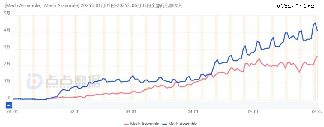 两款产品中,「Mech Assemble」上线时间相对更早。data.ai 的数据显示游戏在 2023 年 12 月就已经开始在 Google Play 上测试,但正式上线 iOS 端则要等到 2025 年初。之后游戏又在 2025 年 3 月和 4 月于日本市场上线 Google Play 和 iOS 版本。游戏发行账号属于 ONEMT 集团,旗下公司包括国内厂商龙腾简合,该账号此前也曾发行龙腾简合旗下 SLG「苏丹的复仇」和「King’s Choice」等产品。点点数据显示,目前游戏最近 30 天双端流水大约在 174 万美元左右,最早上线的 Google Play 端占比更高,超过 60%;其中大部分流水来自美国市场(占比 50%)。