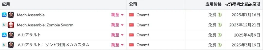 data.ai 显示「Mech Assemble」由 ONEMT 旗下账号(ONEMT 是龙腾简和的母公司),主要负责海外发行业务 | 图片来源:data.ai