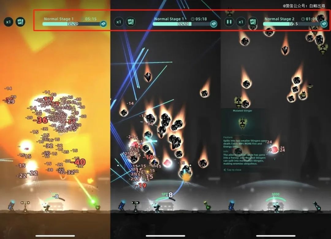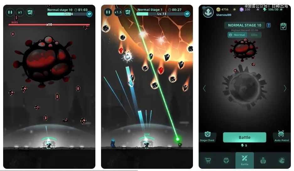 而更像塔防游戏的「Galaxy Defense」则拉长了关卡时间,每一关至少都有 5 分钟以上的时长,通过更循序渐进的难度设计来吸引玩家不断尝试和续命。这个思路此前在乐否科技的 Roguelike 射击游戏「Wing Fighters」里也有出现。通过把关卡拉长,玩家反而有了更强的代入感,感觉到自己的确在不断地挑战一波又一波的陨石和外星人,直到最后壮观的 Boss 战拉开帷幕。