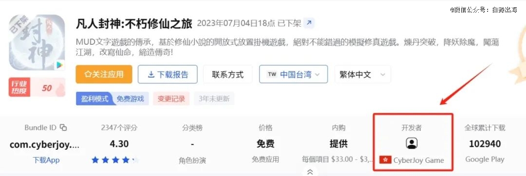 data.ai 的数据显示「Galaxy Defense」的发行账号属于香港厂商 Cyberjoy Game(上图)。点点数据显示该账号此前曾在中国台湾等市场上线仙侠题材放置 RPG「凡人封神」(下图) | 图片来源:data.ai、点点数据
