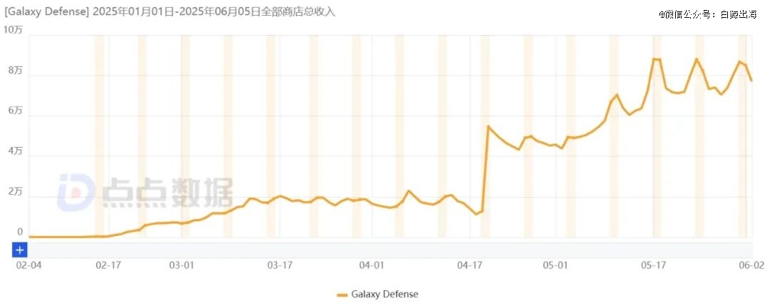 data.ai 的数据显示,「Galaxy Defense」最早在 2024 年 9 月于 Google Play 上线,之后在 2025 年 2 月上线 iOS 版。点点数据显示游戏发行账号“Cyberjoy Game”注册地为中国香港,进一步调查可以发现该账号还曾在中国台湾等市场上线了一款仙侠题材放置 RPG「凡人封神」,天眼查数据显示该游戏在国内由杭州烈酷科技登记著作权。目前游戏最近 30 天流水达到 217 万美元,其中大部分来自 Google Play(占比 72%)。最头部市场为美国(月流水占比超过 30%),其次为韩国(占比 22%)和日本(占比接近 12%)。