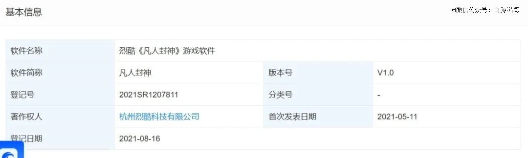 「凡人封神」的著作权由杭州烈酷科技持有 | 图片来源:天眼查
