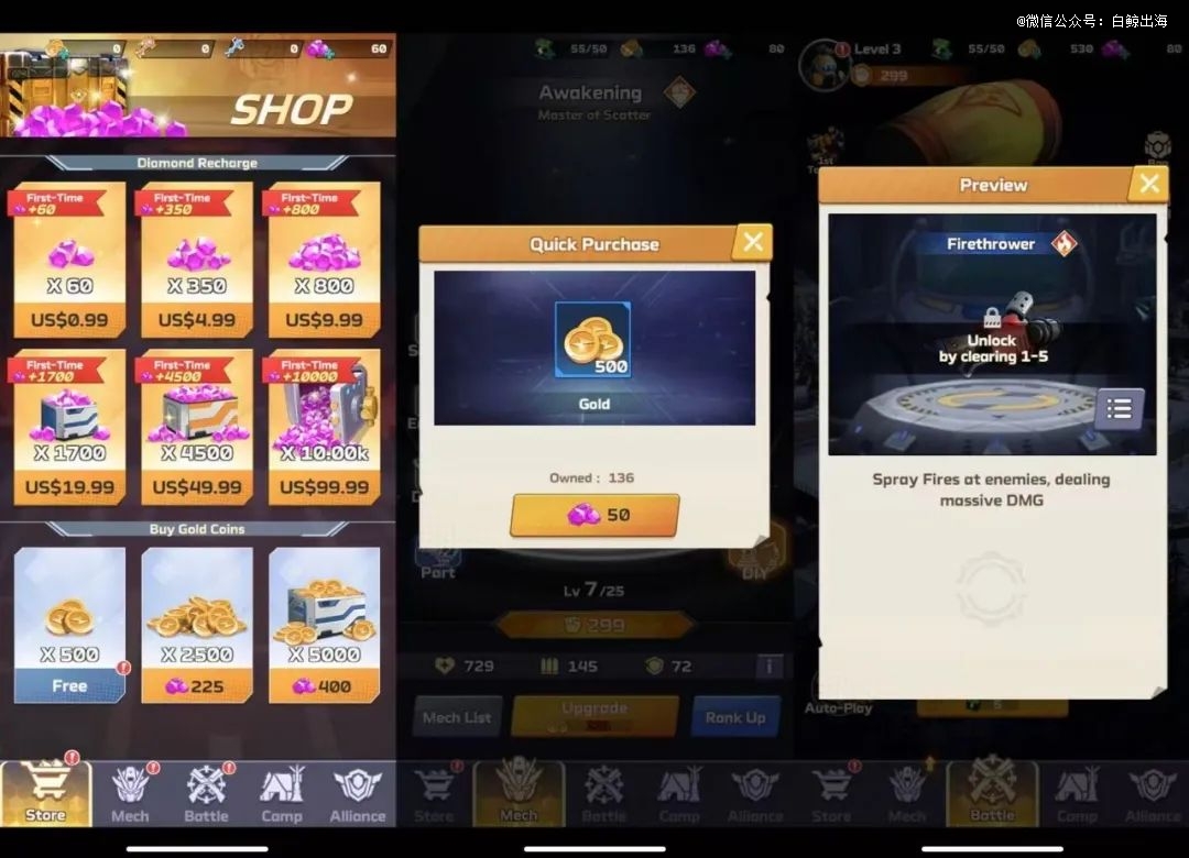 从变现思路上看,两款游戏和「弹壳特攻队」的模式基本一样,玩家需要通过内购来升级机甲和士兵的固有属性和能力(不会在通关后清零),让自己的战斗力不断变强,打败越来越强的 Boss,完成通关。不过在具体执行上两款产品又有所区别。