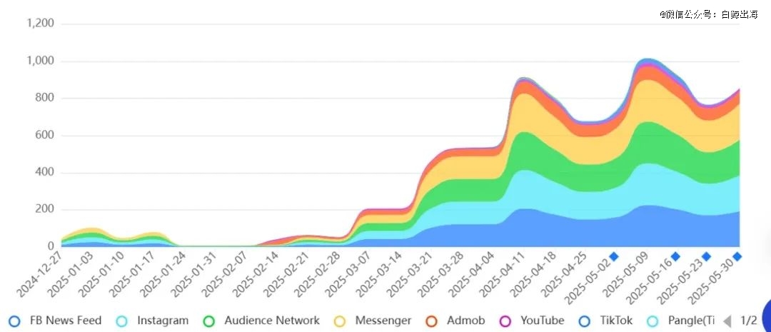 「Mech Assemble」的内购流水从 2025 年 2 月开始*波增长,之后在 4 月迎来第二波增长,增速明显高于 2 月(上图);两次增长时间点和游戏 Google Play 端广告素材投放力度增加时间点相符(下图) | 图片来源:点点数据、广大大