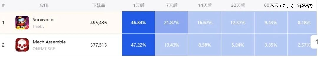 「Mech Assemble」的 Google Play 端 D1留存高于「弹壳特攻队」,但 D7-D90 留存表现都相对偏低 | 图片来源:点点数据