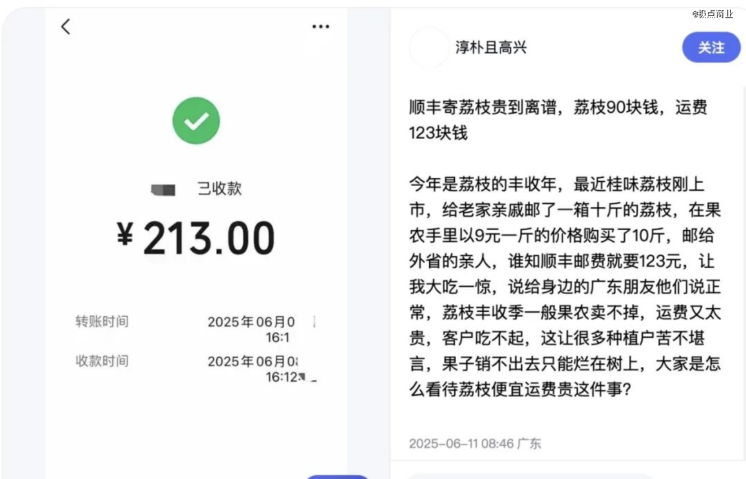 6月11日,一位消费者就在社交平台晒出顺丰单号,称给老家亲戚邮了一箱十斤荔枝,荔枝9元一斤,顺丰邮费就要123元。